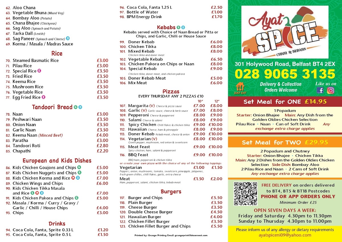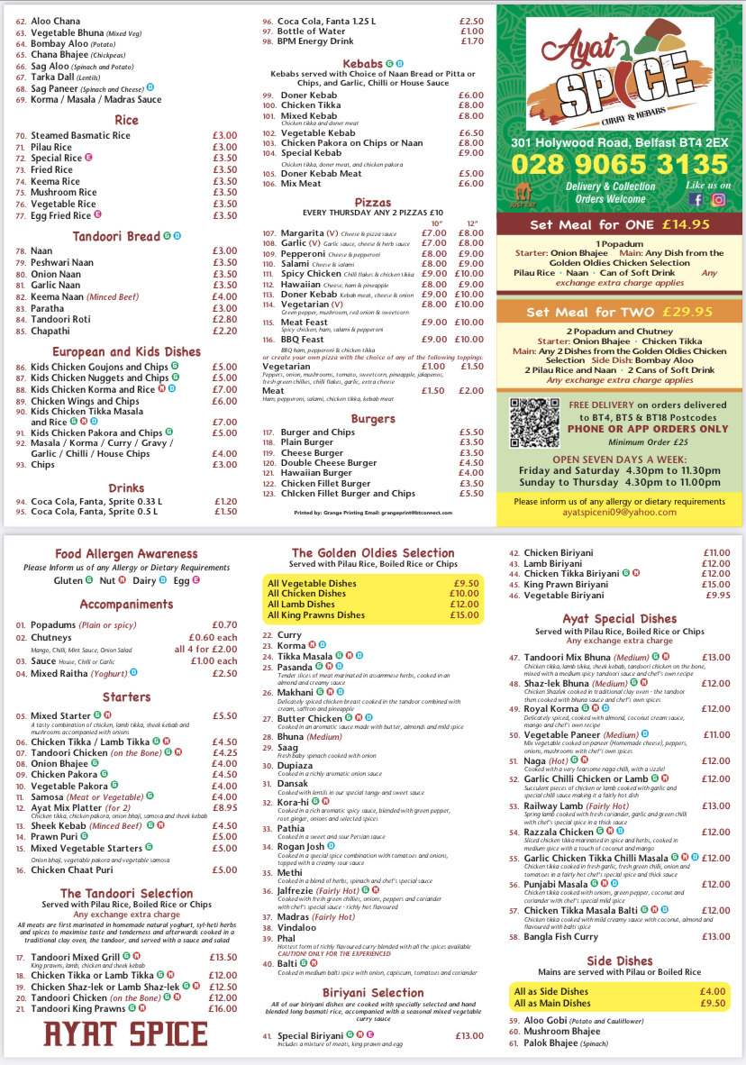 Welcome to Ayat Spice, a culinary gem located at 301 Holywood Rd, Belfast. This delightful restaurant specializes in a diverse range of Balti dishes, each crafted to tantalize your palate. Star of the menu, the Chicken Balti, features tender chicken simmered in a medium spice blend with onions, peppers, and fragrant coriander. For seafood lovers, the King Prawn Balti is a must-try, offering a perfect balance of spice and flavor.