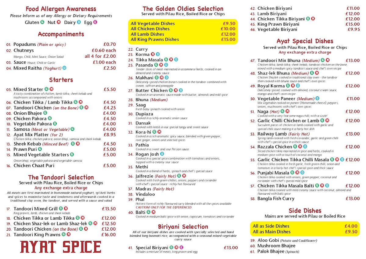 Your dining experience at Ayat Spice is complemented by an array of appetizing starters, including the Mixed Starter and Ayat Mix Platter. The crispy Vegetable Samosa and Onion Bhajee add a crunchy texture, while the spicy poppadoms are the perfect accompaniment to any meal. Join us and indulge in a vibrant taste of South Asian cuisine!